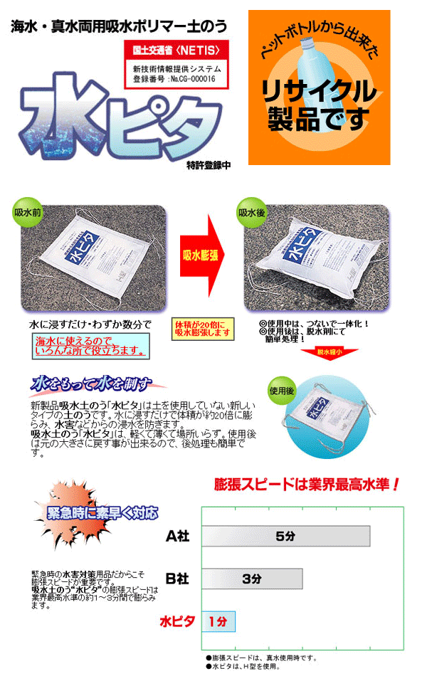 海水・真水両用吸水ポリマー土のう「水ピタ」